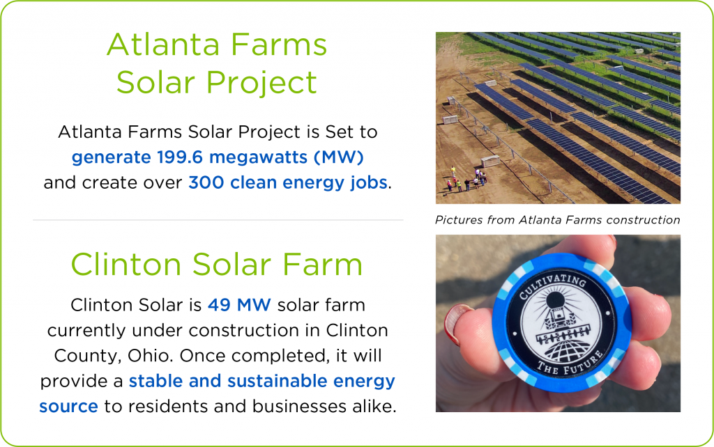 In other Ohio sustainability news, Clinton Solar is a 49 MW solar farm currently under construction in Clinton County, Ohio. Like the Atlanta Farms project, it will use photovoltaic (PV) solar panels to capture sunlight and generate direct current (DC) electricity. The project is expected to enhance Ohio’s renewable energy portfolio, supporting both environmental goals and local economic development. Construction is in progress and operations are estimated to begin in the second half of 2025. Once completed, Clinton Solar will provide a stable and sustainable energy source to residents and businesses alike.