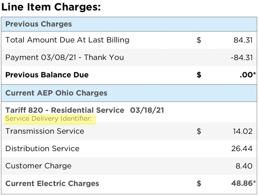 AEP Ohio, the local utility, uses the 17-digit Service Delivery Identifier (SDI) to track your account. The SDI will be needed when you are opting out or opting in to the program and/or when you are calling customer service for assistance Note, there is NOT a “Generation Service” charge on your bill when the account is being serviced by a supplier, like AEP Energy. Generation Service will be listed if you are being served by AEP Ohio.