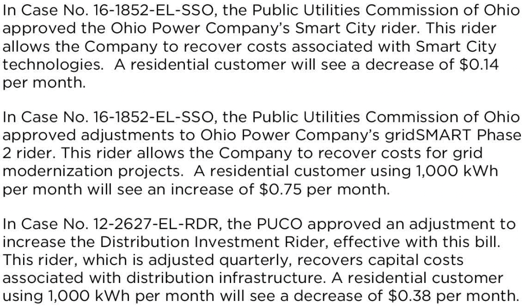 The utility, along with the Public Utilities Commission of Ohio (PUCO) frequently approve and adjust charges that we the rate customers pay through their bill. The utility provides description of the charges and estimates how the new charges affect your billing.