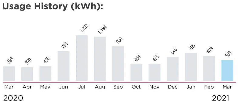 AEP Ohio provides a bar graph to see a 13-month history of energy use for a specific meter. Since the first month and last are stated it’s easy to see how much power is being used for a specific month year over year.